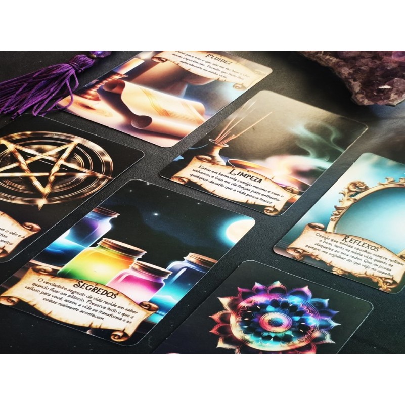 Composto por 35 cartas, este oráculo oferece mensagens reflexivas para o seu bem-estar.
