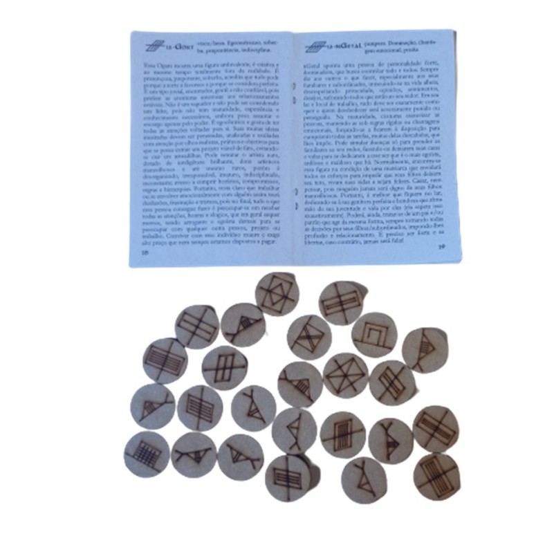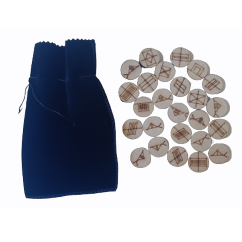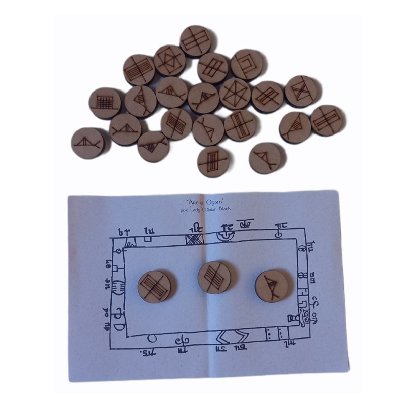• 25 peças de MDF redondas 2,5cm de diâmetro, 6mm de espessura, gravadas com os símbolos do Ogam das Sombras